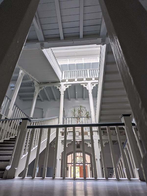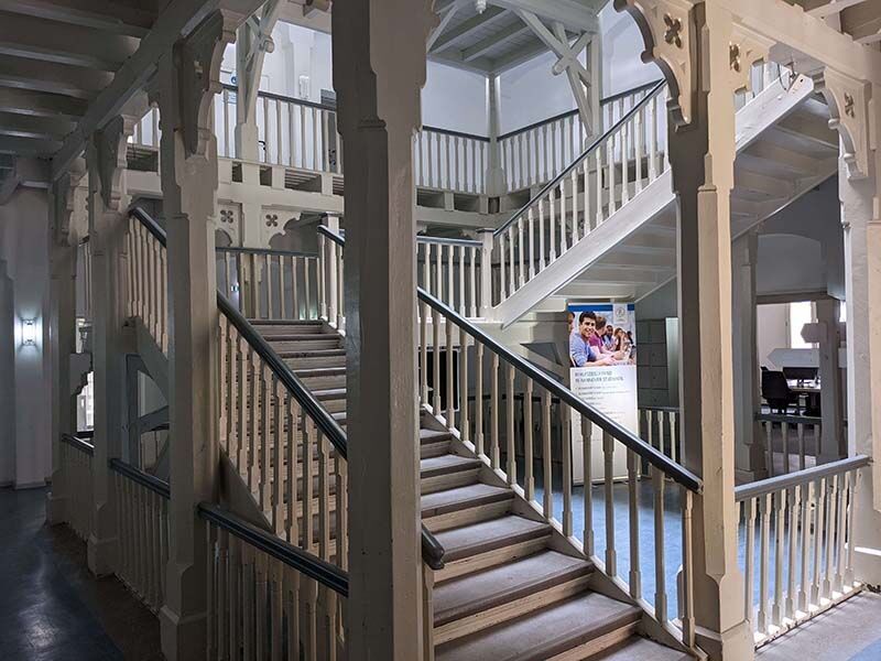 Mit historischem Charme begrüßt Sie der eindrucksvolle, denkmalgeschützte Altbau zu Ihrer Weiterbildung. Das große Treppenhaus in Holzbauweise ist ein echter Hingucker. Es gibt aber auch einen Fahrstuhl, denn die Schulungsräume reichen vom Untergeschoss bis zum dritten Stock. Der Zugang von der Eingangsseite zur Calenberger Esplanade ist barrierefrei.