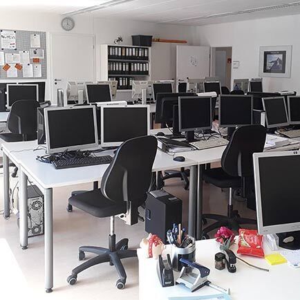 Trotz der lebendigen Lage sind die Schulungsräume in der 1. Etage des Bürokomplexes angenehm ruhig. Ihr Unterricht findet hier zwischen 8 und 16:15 Uhr statt. Die Arbeitsplätze sind in Sechser-Inseln aufgeteilt und dank der großen Fensterfronten schön hell. Besonderer Vorteil: Der große Balkon vor den Fenstern sorgt für sauerstoffreiche Pausen mit Blick ins Grüne des Listplatzparks, in dem Sie sich mittags erholen können. Sie können auch eines der entspannten Straßencafés besuchen oder ein asiatisches Menü genießen. Für die schnelle Stärkung bietet sich der Bäcker im Erdgeschoss mit kleinem Café an. Kaffee und Tee können Sie sich zwischendurch auch in der Küche mit Spülmaschine holen.