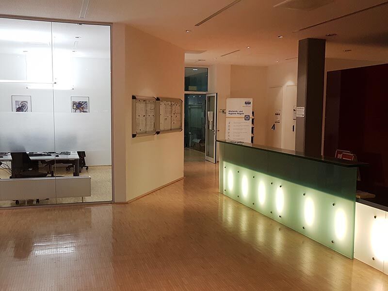 Über eine Treppe (auch rollstuhlgerechter Zugang möglich) erreichen Sie den großzügigen und offenen Eingangsbereich mit Verwaltung/Anmeldung und die Schulungsräume. Ihr Unterricht findet hier zwischen 8 und 16:15 Uhr statt. Hohe Decken, durchgängige Fensterfronten sowie Glaswände und -türen sorgen für ein luftiges Raumgefühl. Die Aussicht geht zum Teil in Richtung der parkähnlichen Anlage mit Bänken hinter dem Haus. Dort können Sie sich in Pausen bei idyllischem Vogelzwitschern entspannen. Wenn Sie lieber drinnen bleiben möchten, machen Sie es sich auf der Sitzecke gemütlich. Hier im Pausenbereich finden Sie auch einen Automaten für erfrischende Kaltgetränke sowie einen Kaffeeautomaten mit verschiedenen Heißgetränken. In der kleinen Küche stehen Kühlschrank, Geschirr, Spülmaschine und Wasserkocher bereit. Viele Teilnehmer nutzen die Mittagspause auch für einen Spaziergang zum Limpurger Platz, einem kleinen belebten Marktplatz, um sich etwas zu essen zu holen. In der anderen Richtung liegen ein Discounter und Getränkemarkt.