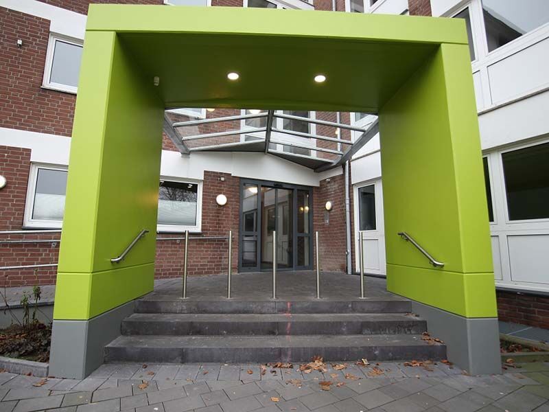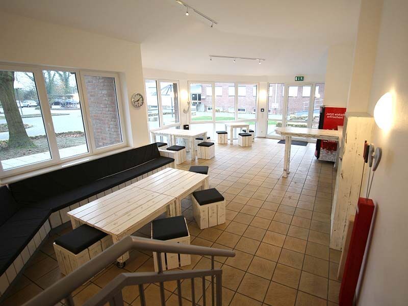 Die Umgebung am Ortsausgang des Stadtteils Burgsteinfurt liegt zwischen einer ruhigen Wohnsiedlung und der Tecklenburger Straße. Grünanlagen und alter Baumbestand sorgen für eine entspannte, ruhige Atmosphäre. Ihr Unterricht findet von 8 bis 16:15 Uhr im sogenannten Grünen Haus statt. Es wurde 2014 kernsaniert und barrierefrei umgestaltet. Die Schulungsräume präsentieren sich mit modernem PVC-Boden in Holzplanken-Optik, der Blick geht in die Gärten der angrenzenden Wohnsiedlung.
