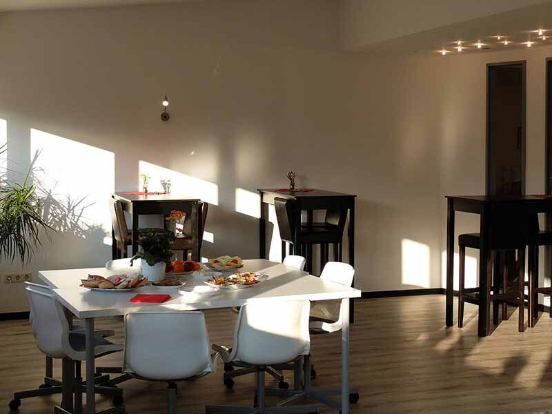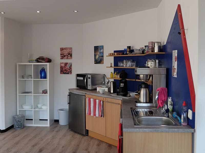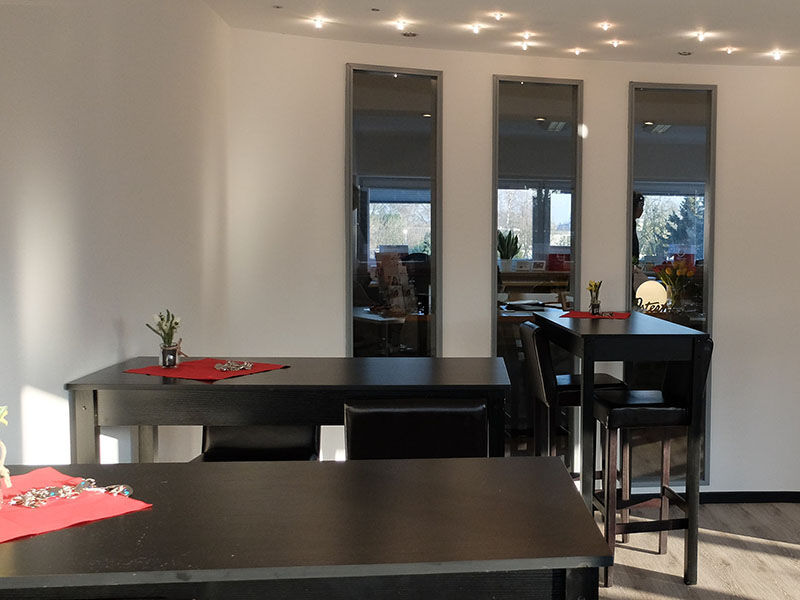 Die Unterrichtsräume in der zweiten Etage sind bei Bedarf mit dem Aufzug erreichbar und lassen durch ihre zahlreichen Fenster viel Licht herein. Der Eingang befindet sich an der Halterner Straße. Wer viel lernt, braucht auch mal eine Pause: Dann lädt der Eingangsbereich mit seinen hohen Tischen und Barhockern zum Entspannen und Plaudern ein. In der Küche finden Sie alles, was Sie zur täglichen Versorgung brauchen: Kaffeemaschine, Wasserkocher, Mikrowelle, Kühlschrank, Geschirrspülmaschine. Und wer sich außerhalb etwas besorgen möchte, findet in etwa fünf Gehminuten einen Lebensmitteldiscounter.